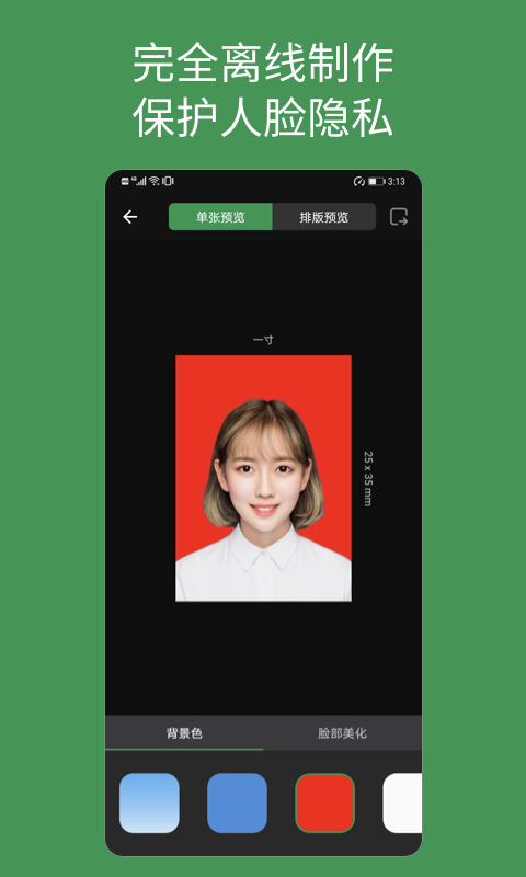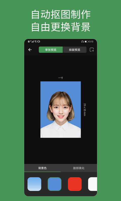 4、白底、红底、蓝底等多种底色,一键自动抠图,秒换证件照底色,快速拍出优质证件照
