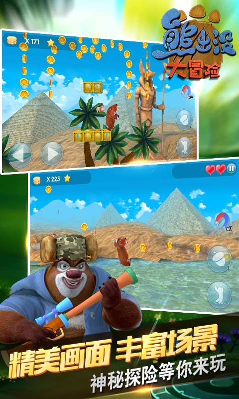 熊出没大冒险是一款冒险类益智休闲游戏,动画授权,3D横版动作冒险游,熊大带你勇闯神秘国度!熟悉的光头强和熊大熊二,加入游戏,去不经意的地方寻找宝藏,开动脑筋揭开各种谜题!喜欢熊出没的朋友不妨下载试试吧