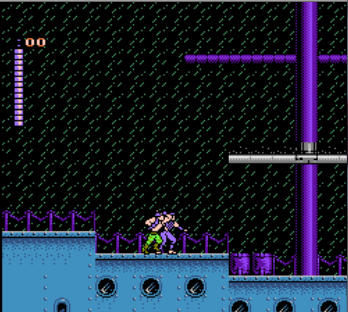 游戏讲述了在未来美国废土,蓝衣忍者Hayate(疾风)与红衣忍者Kaede(枫)联合击败邪恶加尔达王的故事。除了标配的忍刀,你的忍者还能使用镰刀,它的攻击范围更大,但近战吃亏。此外,还有数量有限的忍者镖与炸弹。你还拥有一套能够击中屏幕上所有敌兵的费血大招。不幸的是,大部分敌人都不是一两下能杀得死的,因此这招费血技的效果有时并不明显。