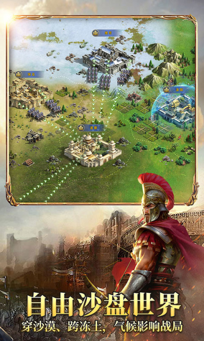 游戏高度拟真全球沙盘地图,取材于千年真实历史,完美重现人类文明演进的恢弘篇章。游戏中的一切都与现实高度吻合,攻城略地时,你必须逐一占领周边城池,一路推进;建设国家时,也要考虑地理因素,沿海重镇发展航海,内陆城市推进农耕。这里没有简单的人工关卡,你要面对的是独一无二的真实世界!
