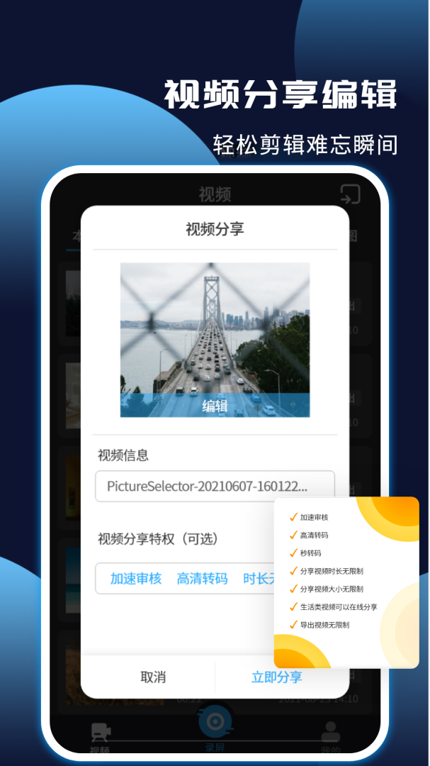 1、视频管理]丰富的视频管理功能,编辑,删除,共享,免费视频导出