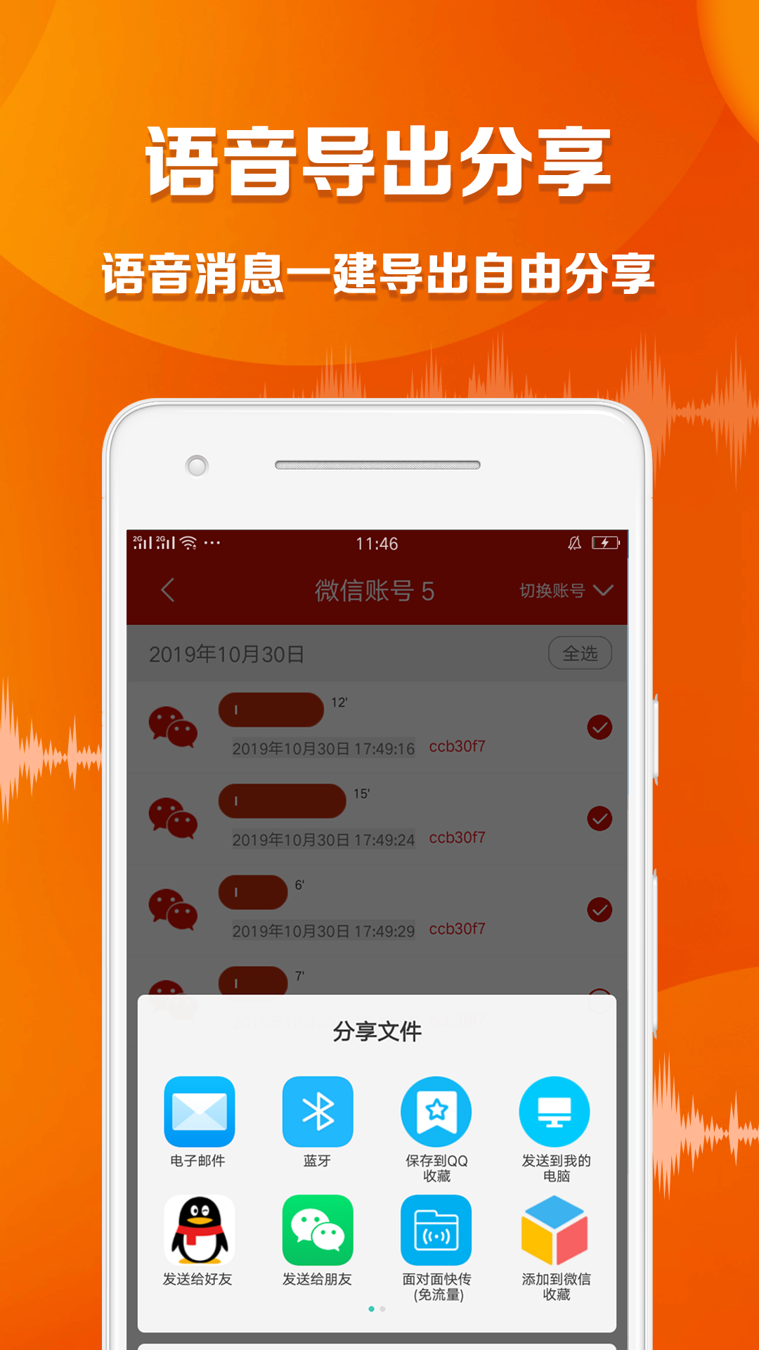 语音导出大师支持多种分享方式,一键即可将你的语音文件分享给好友