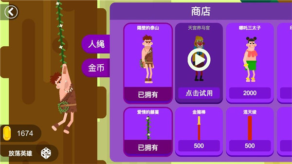 放荡英雄是一款比较休闲的游戏,该游戏中的画面是十分有趣味性,整体风格是比较幽默的,玩家在游戏中是一名英雄,通过抓住藤蔓在森林里面荡来荡去,要避开各种障碍物,比如恐龙、火焰、乌贼墨等等,然后到达终点,该游戏中玩家也是可以进行各种角色更换,让你感受其他的人物,可以适合适合玩家游玩,可玩性极高,还在等什么?赶快下载吧!