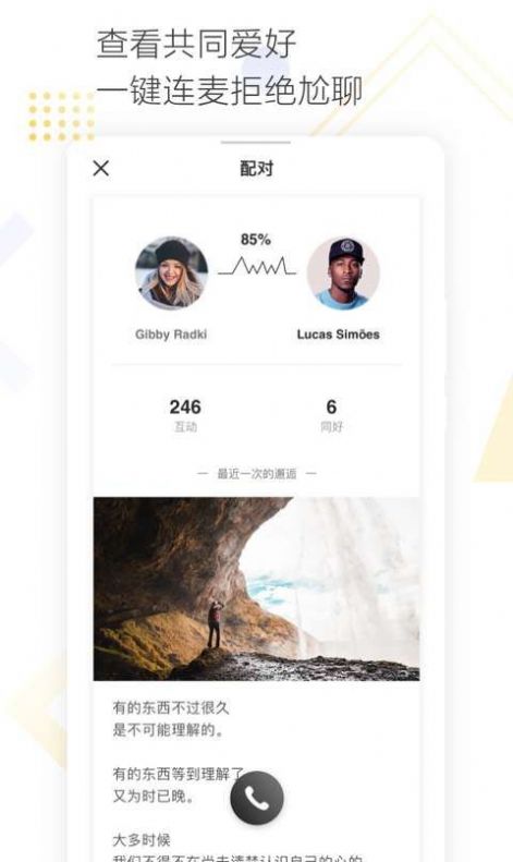 5、依据客户兴趣标识,缘份大圣配对的TA,即时视频面对面交朋友,闲聊约会交友不难堪