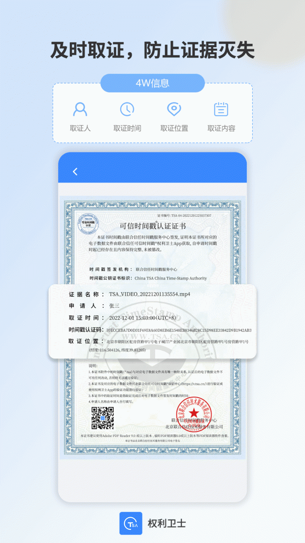 【权利卫士】是一款司法认可的移动取证固证工具,广泛应用在民事纠纷取证、行政执法取证、现场见证等场景,解决了证据固定的及时性和司法认可复杂性等问题。权利卫士覆盖现场取证和线上取证双模式,任何人都可自助完成取证固证,取证后即刻出证,具有及时性和便利性。
