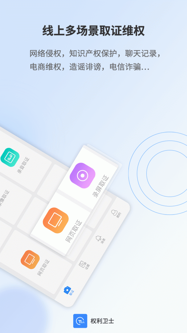 【功能全面】权利卫士拥有拍照取证、录像取证、录音取证、网页取证、录屏取证功能,通过权利卫士可实现线上线下多场景取证模式,实现证据在手、维权无忧、及时取证、有备无患 。