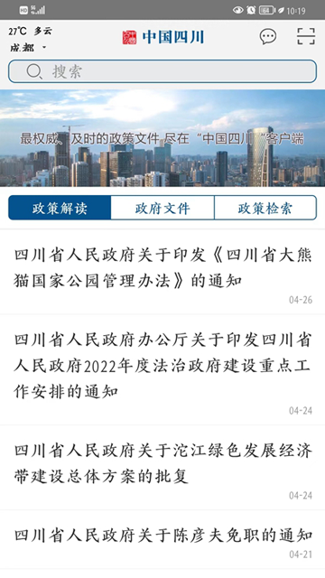 3、政策文件”作为“中国四川”客户端的特色板块,将省政府的重要文件进行系统发布,还可以在线搜索,有效服务于移动互联网上的您