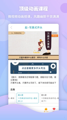 2、微视频动画授课,风趣幽默干货满满,8分钟掌握1个写作技巧,5分钟课后精准练习,1分钟记住万能公式;更有十大必考专题精讲课程,倾情奉上
