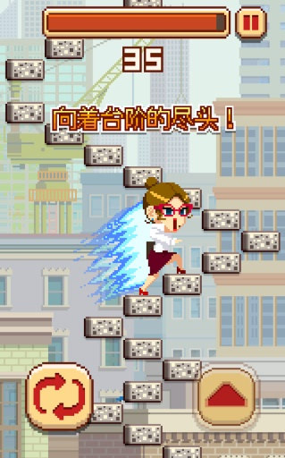 游戏的玩法十分简单,我们需要尽量让我们控制的角色达到更高的阶梯。在到达每个阶梯后都会有新的倒计时读条,并且随着阶梯越来越高,读条越来越快(要求玩家的反应越来越快)。我们需要及时反应,控制角色转身跳跃或者直接跳跃,若是跳空,则游戏失败。就是这么简单,游戏完全是在挑战大家的反应能力。
