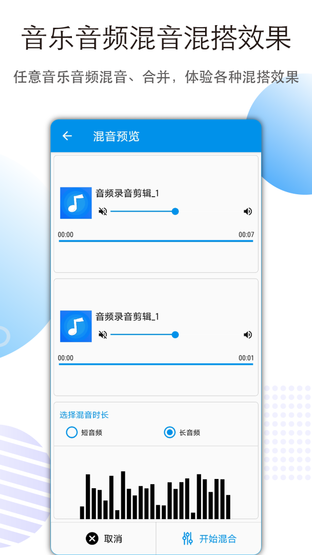 混合两种MP3的声音来创建混搭或混音,任何音频格式均可混搭,让你有更好的剪辑;