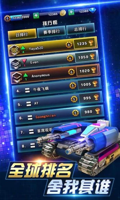 在众玩家中,怒爆高手,横劈菜鸟~在排行榜那实力的天梯中夺取属于自己的位置!来《坦克争霸大战》,用你的实力证明的荣耀