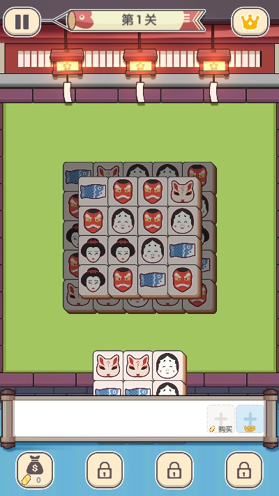 点击榻榻米上的方块元素,并将3个相同的元素放置到卷轴上即可消除。消除完该区域内所有方块即可获胜!如果卷轴上有7个以上的方块,游戏将结束。