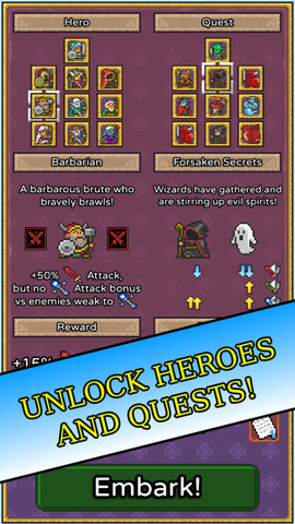极简rpg游戏是一款休闲多英雄挂机养成游戏。游戏使用了非常简洁的像素风,里面有很多不同职业的英雄人物,还有各式各样的武器装备可用,这里不需要大伙控制战斗或者冒险,只用升级各种装备和宝剑的属性即可,勇士们会携带对应的工具自动战斗,然后不断的向更深处进行探索。