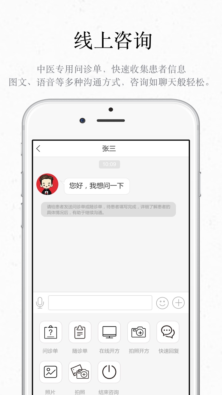 6、线上咨询,中医专用的问诊单,快速收集患者的信息,图文、语音等多种沟通方式,咨询如聊天般轻松