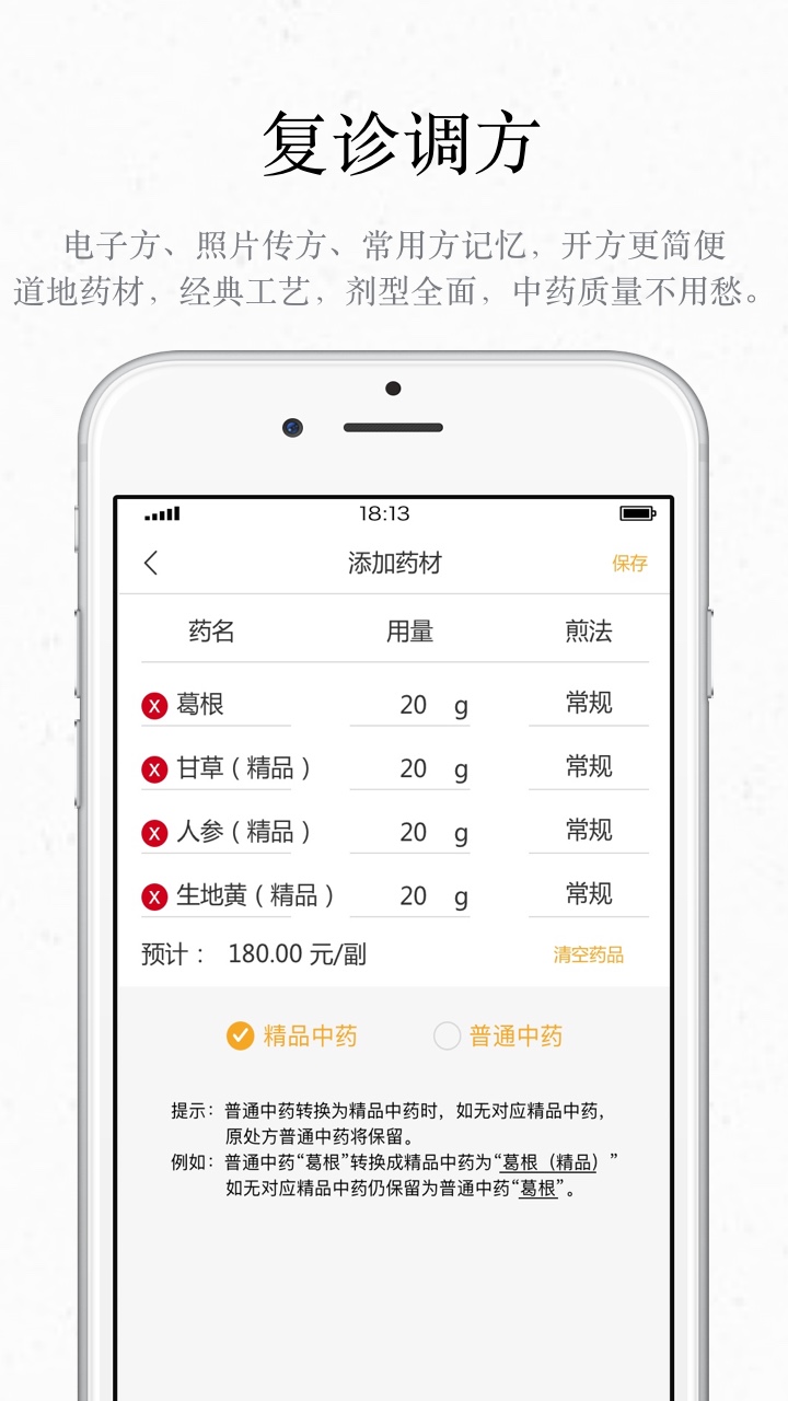 5、复诊调方,电子方、照片传方、常用方记忆、开方更简便,道地药材,经典工艺,剂型全面,中药质量不用愁