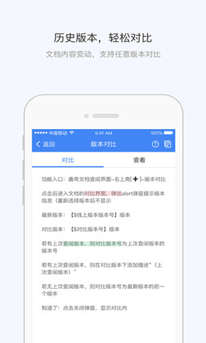 【版本对比】文档修改支持版本对比,您不需要每次都全部看一遍文档,只需查看文档和上次看过文档的异同