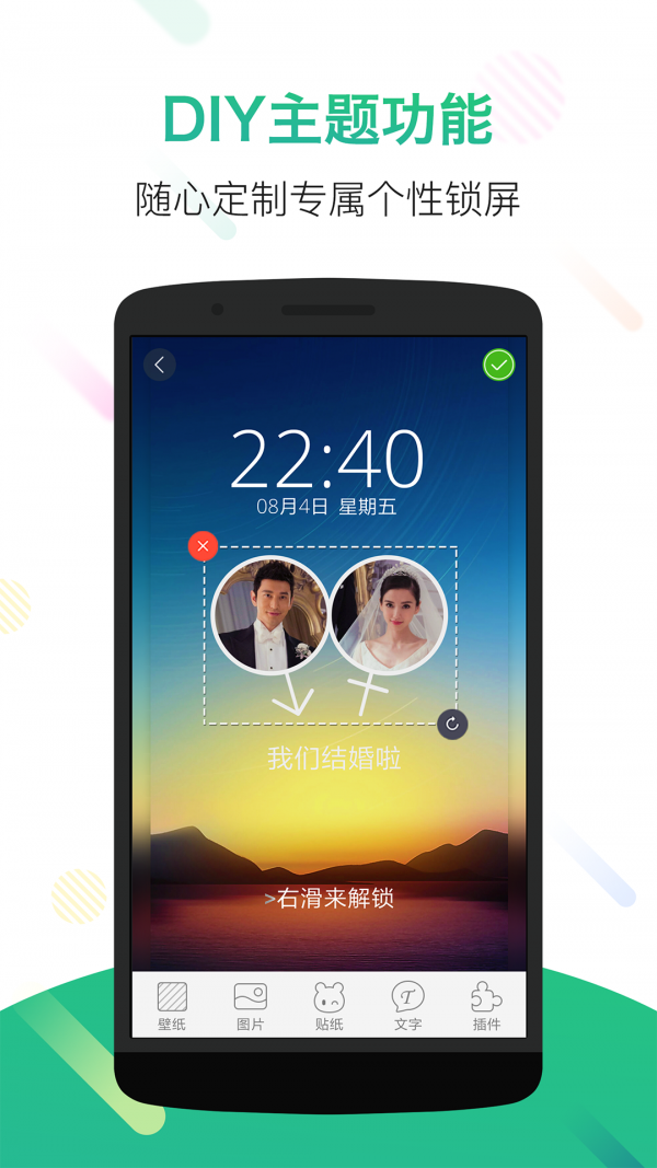 3、定制锁屏:强大DIY功能,锁屏和解锁样式都可用照片和文字重新定义
