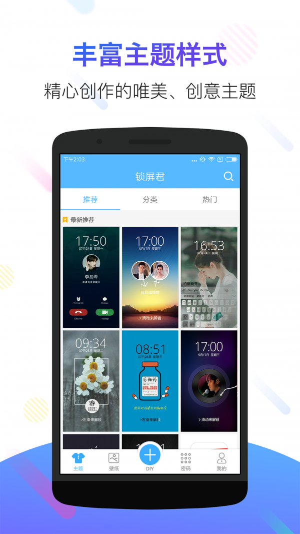 锁屏君是一款非常好用有个性的手机锁屏精灵,丰富有趣的锁屏界面和主题,好玩的解锁方式,多种主题素材在线下载,为你的手机增添不一样的色彩,每天都能不一样哦,喜欢的快来下载使用吧