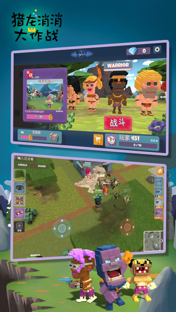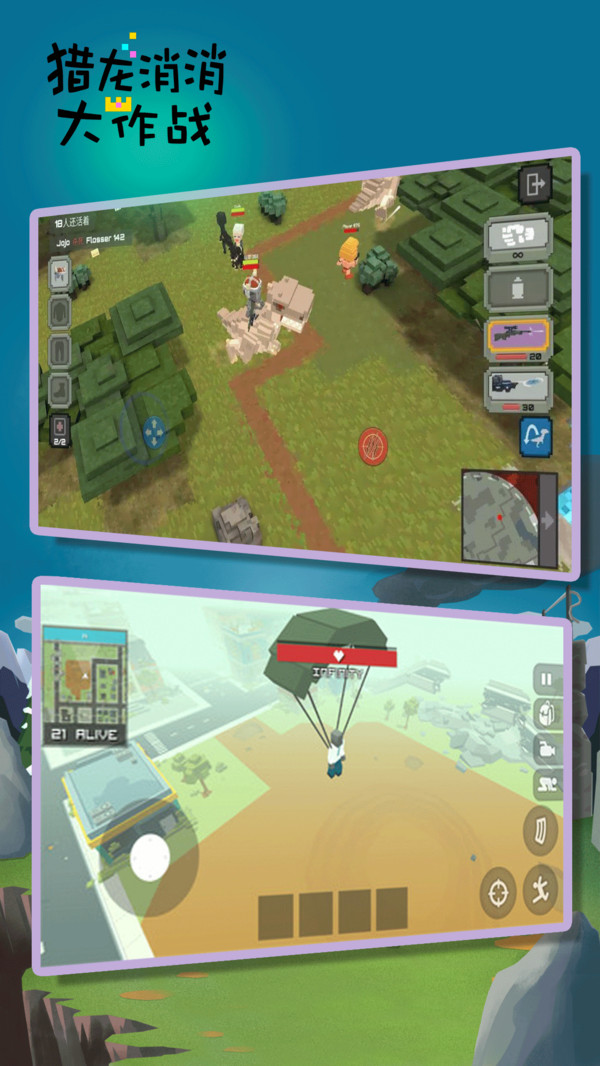 猎龙消消大作是一款吃鸡对战玩法的像素手游,游戏有着3D像素风格的画面和自由吃鸡对战玩法,在恐龙世界选择自己的伙伴一起和全球玩家激战恐龙岛