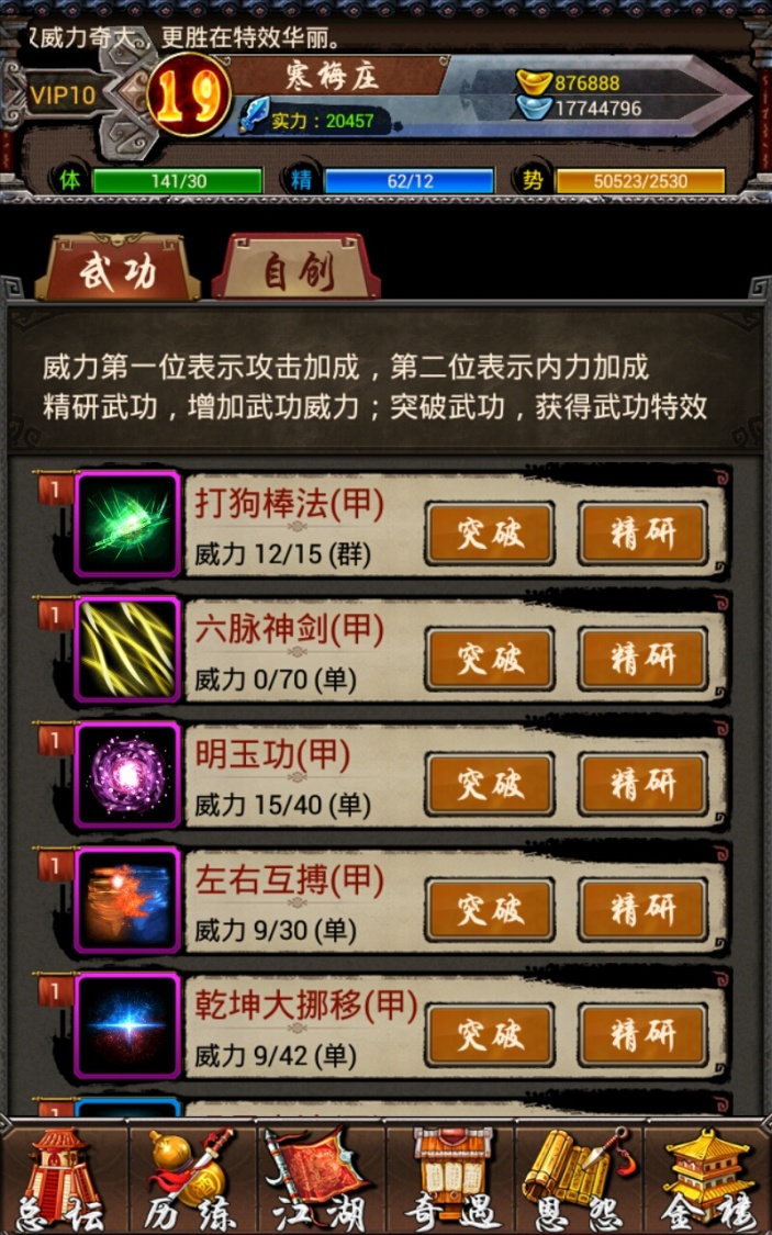 在武功列表中,点击“突破”进入突破界面。突破时会消耗闭关令,且如果不是参悟,则有50%失败的概率,失败一样会消耗闭关令。