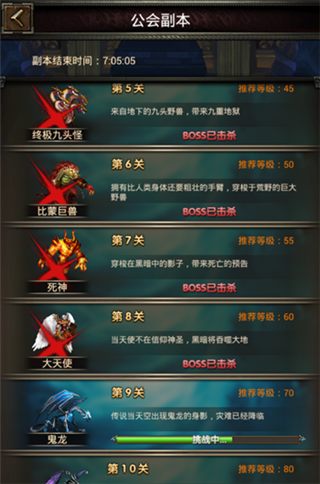 公会副本:公会等级到达2级时可开放公会副本。刷爆资源靠的就是团队合作,成员齐心协力击杀公会BOSS,必会获得紫装、紫装碎片、紫金宝箱、紫金钥匙中随机分配的物品,未击杀完成将无法获取噢。点击左下角的鼓舞,消耗50钻石可以增加1次5%的伤害,增加2次就是10%,增加3次就是15%等。伤害提升是击杀BOSS的利器。每关挑战成功还将增加1000点的公会繁荣度。