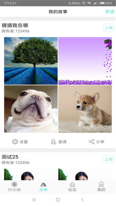 2.时光轴页面中部有醒目的红色上传按钮.(提醒:没有创建过故事的用户上传照片会自动转向“开启新故事”页面,您必须先创建一个新故事才能上传图片.);