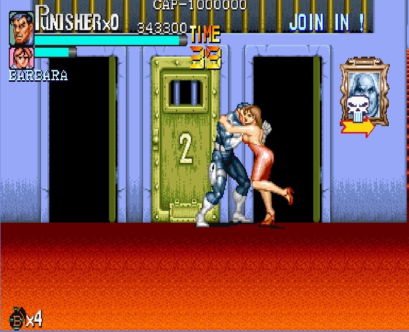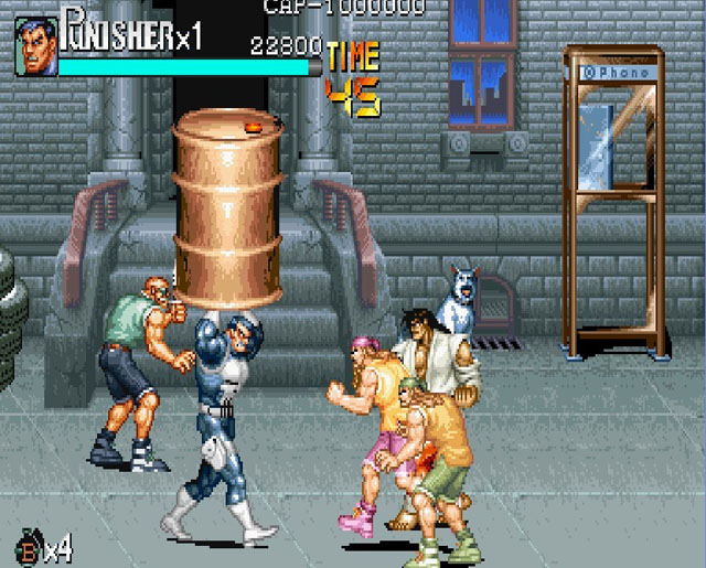 惩罚者是跟恐龙快打一个时代的游戏,但可玩性个人感觉要比恐龙快打好。说说出招,简单组合拳,一顿按A,如果拉住前按A,人物在组合拳的时候会往前走。下上A,跟恐龙快打人物的特殊技差不多,从下往上用脚就划出一道白刃,2P人物的白刃比1P人物的要远。AB,就是通常说的保险,原地AB的时候是在原地不动,前前AB人物会在跑的途中滑步AB。特色系统,手雷,怎么用呢,按B,就是跳起来再按AB,人物会放雷。还有一种情况,人物的血见底了,不够一个保险的血量,人物在有手雷的情况下,这时你按AB,会把手雷丢出去然后人物卧倒。还有一些特殊技,比如说,楼主一定玩过三国志,惩罚者中也有一般街机闯关类游戏的一大特色,投技!就是抓人,抓到人之后,前A就是把人丢出去,按B,再按A就是把人从空中丢出去,按B再按下A,一招倒栽葱,很帅。npc倒地时,人物可以过去将他举起来,第二关第五关boss除外,举起来之后按A将人丢出。在你抓到NPC的时候,直接AB就可以将人甩起来,但这招跟AB一样,需要血量,并且可以通过方向键控制
