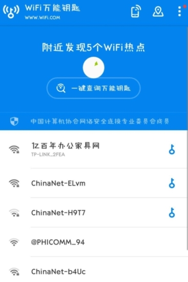 点击一键查询,秒速发现免费WiFi热点,一键安全连接,操作简单,上网就是这么轻松。内置中国移动CMCC、中国联通ChinaUnicom、中国电信ChinaNet等运营商热点,安全连接,方便便捷。