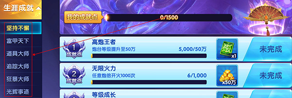 有坚持不懈、富甲天下、道具大师、追踪大师、狂暴大师、光辉事迹六大成就任务,以炮塔升级、使用技能、倍率捕捉等任务为主,达成成就点还能领取高级道具装扮。