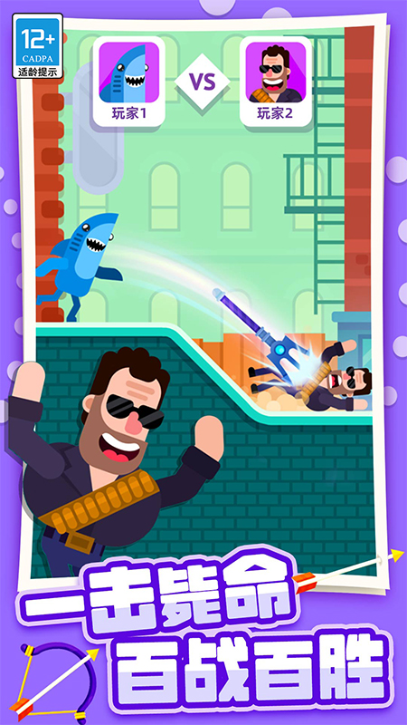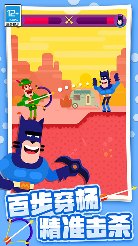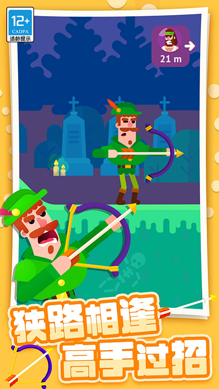 5、游戏操作非常简单,玩家只需要通过点击屏幕来调整角色的射击角度和力度,在出手之前依据敌人方位射出弓箭就可以了。游戏中需要在基础的互射模式中胜利到一定的场次,才能够解锁更多的例如狩猎野鸭、射苹果等游戏玩法。此外,游戏还有支持两位玩家之间 PK 的双人对战模式和纯粹锻炼自己射击技巧的无尽模式等