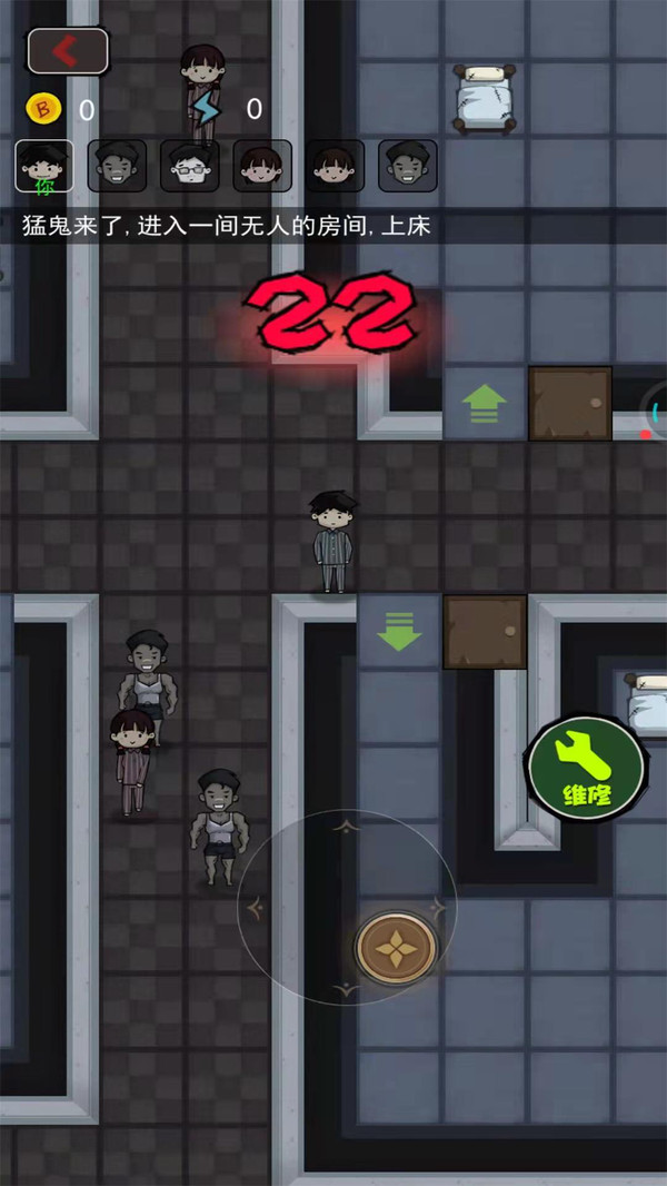 1、进入游戏,选择空闲的房间进行入睡,等待游戏开启。按照游戏任务进行升级床铺、炮塔等。