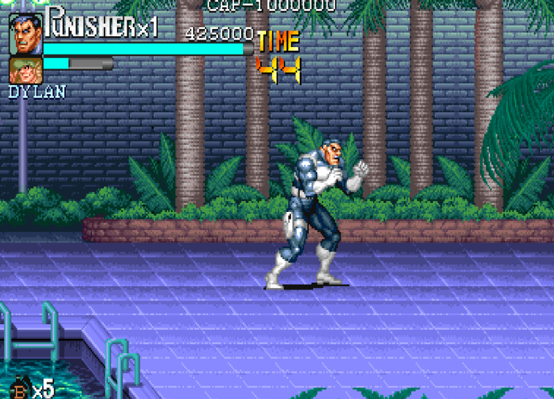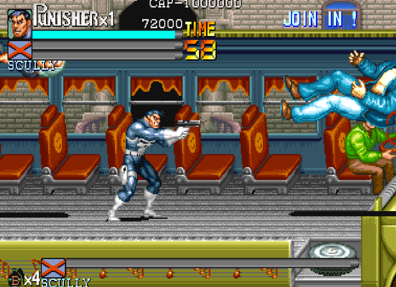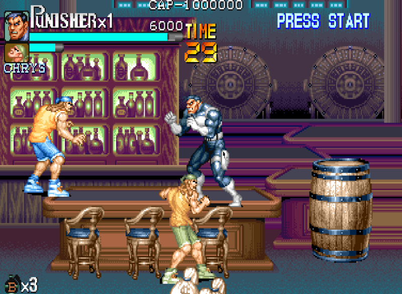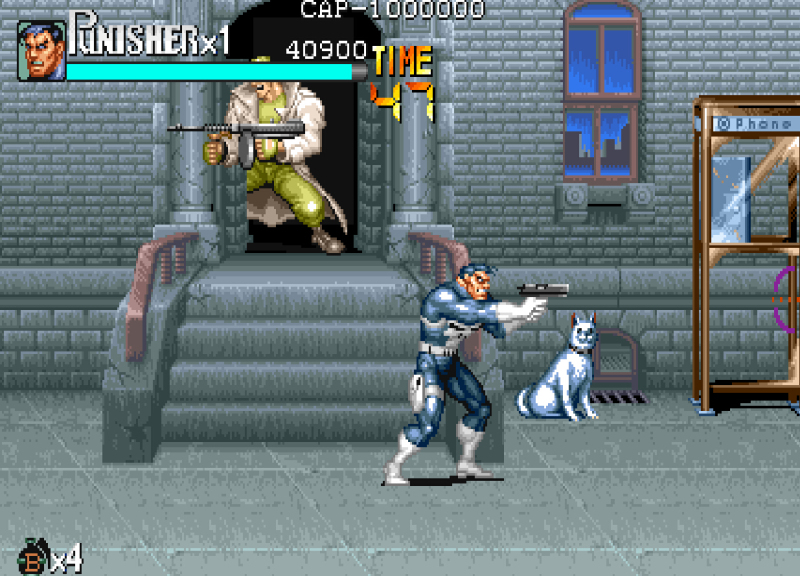 单机游戏惩罚者,俗称“快四”,改编自美国人气漫画,,亦有同名电影.说的是一名前警官面对社会的不公正,独自一人充当起执法者的角色. 游戏中只能选两个人, 而且主副机不可互换.游戏的人物造型巨大, 达到了CPS1的极限, 这可能也是可选角色数量变少的原因之一. 和同年的《恐龙快打》不同, 道具的作用还停留在吞食天地2的阶段.尽管如此, 由于惩罚者在CPS1游戏画面上究极的表现,它仍旧算得上是一部名作。
