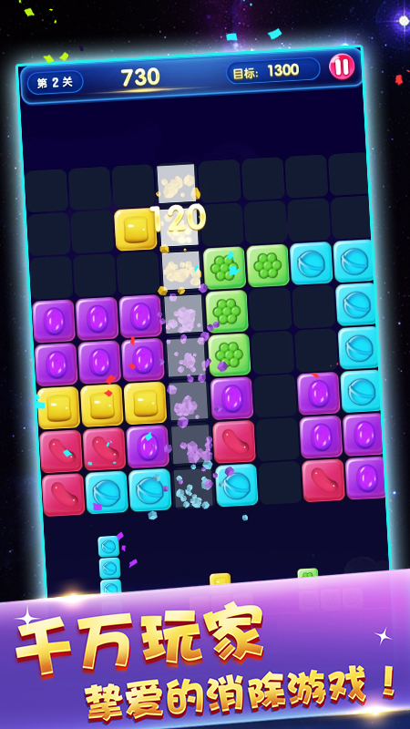 游戏挑战:精心设置的更多花样供你选择!经典模式,糖果模式,拖动模式,方块模式 ,多种创意道具组合,每场消除都充满意外!