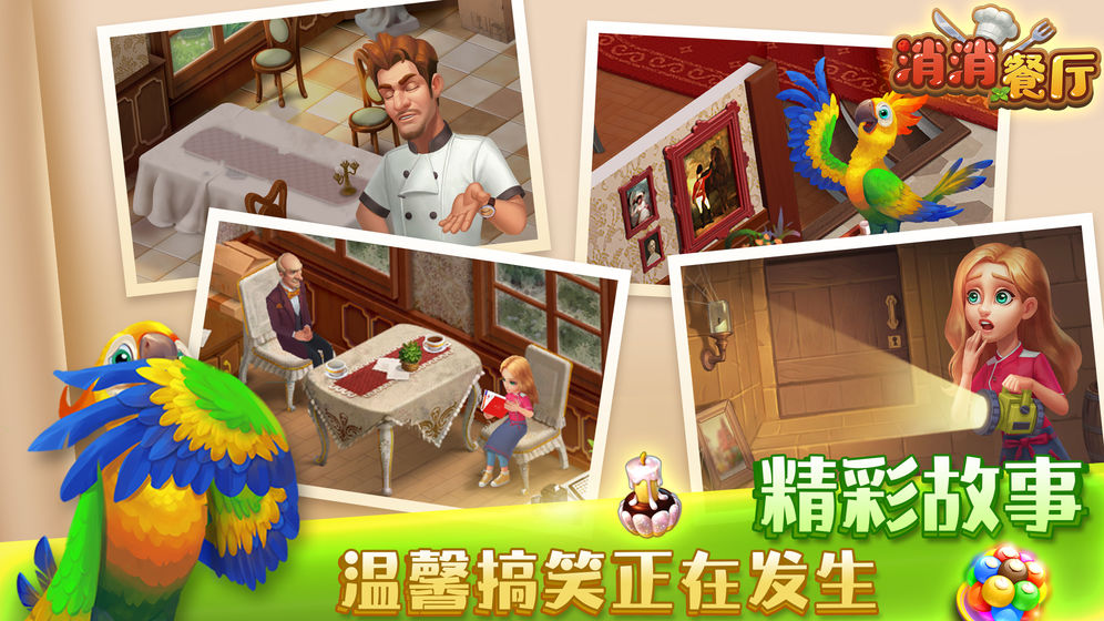 6、除了面对挑剔的顾客,接待热心的邻居,甚至还要迎接竞争对手的新挑战!沉浸式剧情让你体验振兴餐厅的乐趣!在这里每天都在发生温馨有趣的新故事,用你和安娜,还有萌物鹦鹉的智慧将餐厅经营的有声有色吧