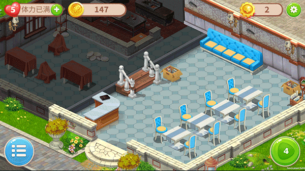3、趣味解谜装扮,从最基础的用餐区开始,随心所欲地更换家具,墙纸,甚至花园和厨房!挑选你最爱的风格,一步一步解锁更多区域,让餐厅里里外外大变样