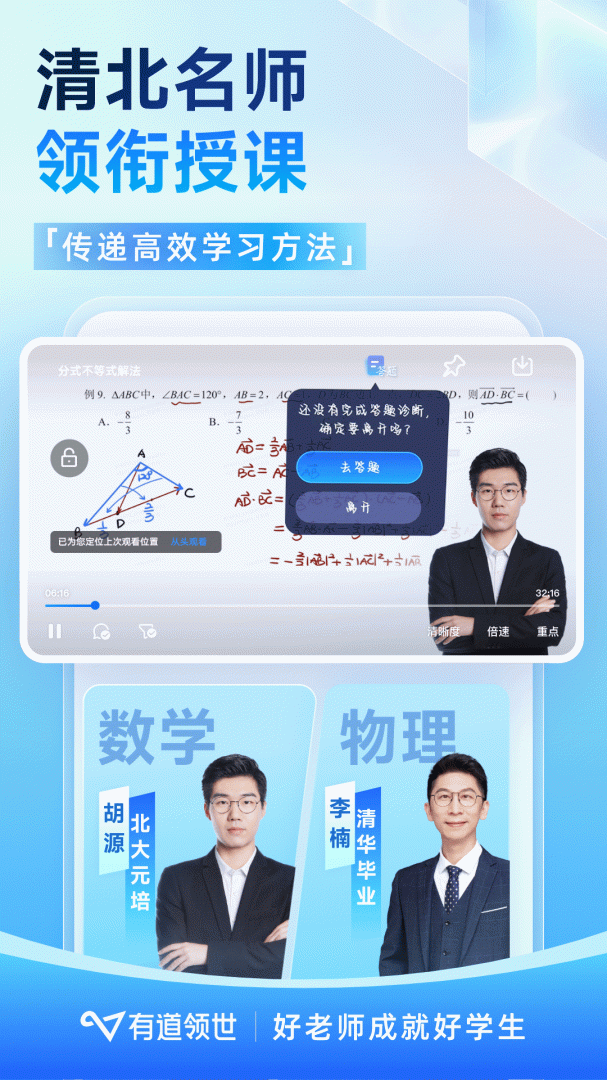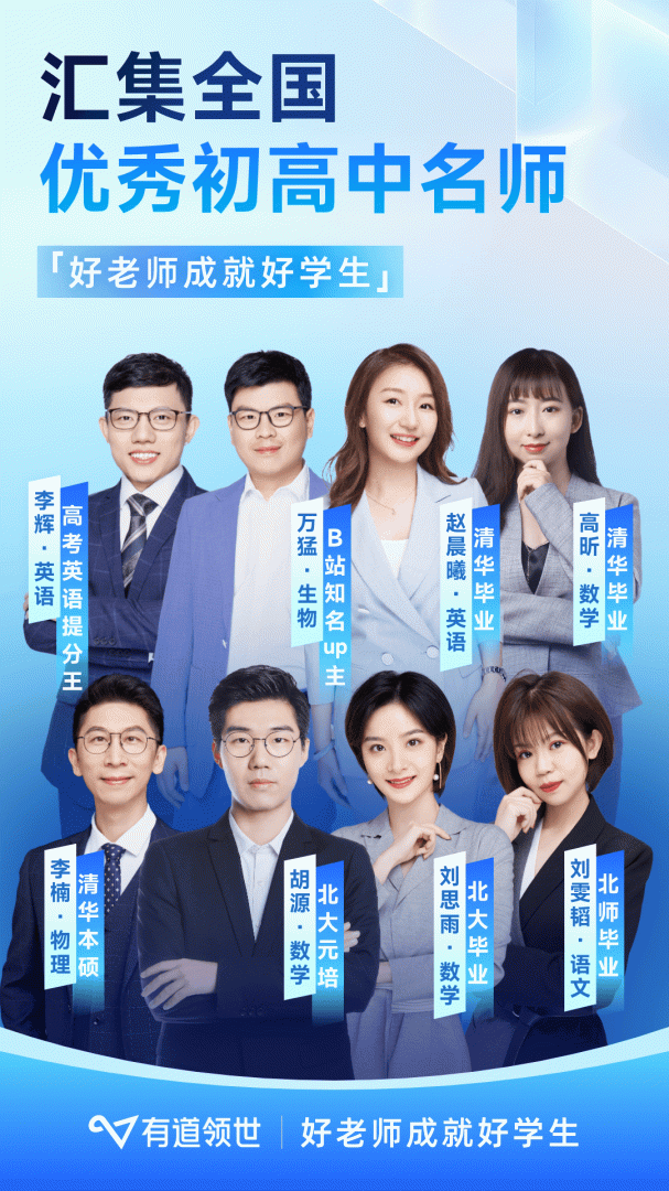 有道打造的一款学习指导软件,汇集了众多对高考、中考有多年教学和研究经验的领世培优名师,学校/专业选的好,未来道路节节高