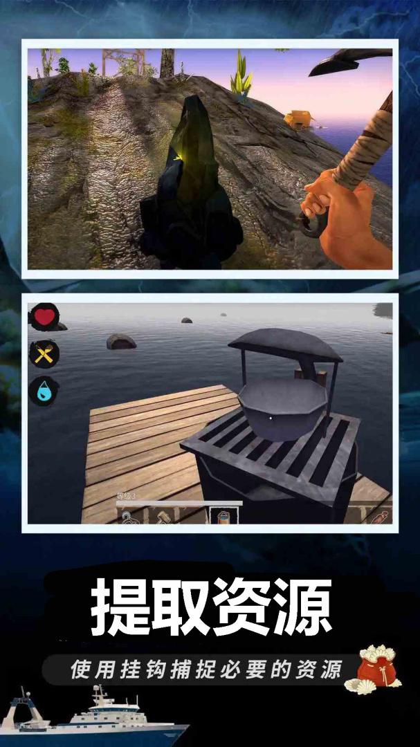 1、你需要利用手中的钩子去勾取海上的物品,来建造各种器械和装备,同时你还需要面对凶险的海上食肉生物