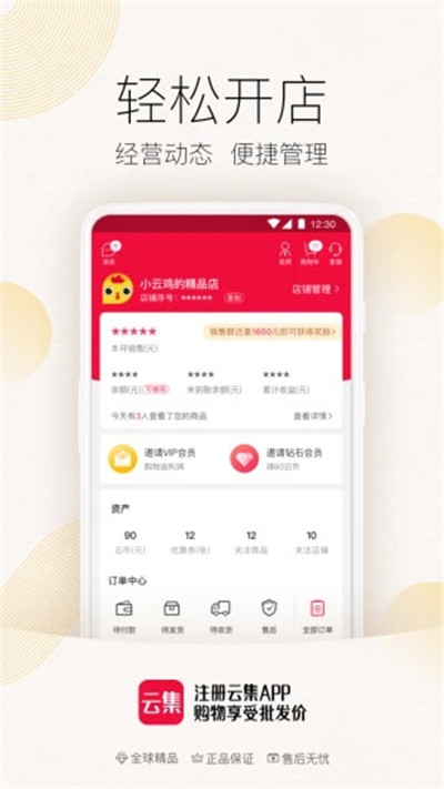 2.轻松经营: 云集所有商品不需要打款,不需要压货,店主出售商品后即可获得利润,云集专属物流中心统一发货,专属客服提供售前售中售后服务各种问题。