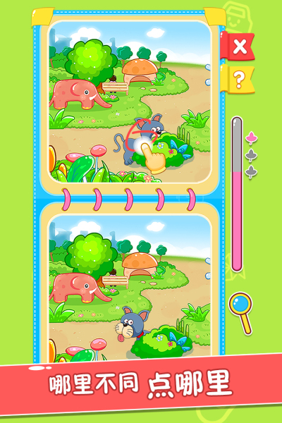 经典的找茬类游戏,画面充满着可爱的气息;关卡的难度适宜,细心观察一定可以过关,但是如何做到最快,还是要看玩家自己;在游戏时会有一些有助于集中注意力的音乐,这点设计的很贴心。