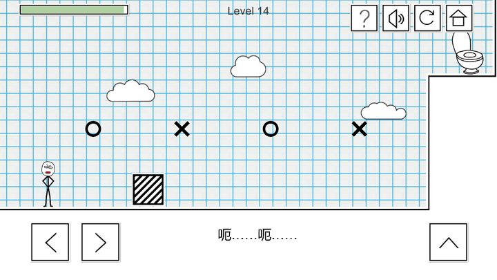 第14关:在空中有两个X,点击这两个X,这样两个X就会变成木箱子,我们推动下面的木箱子,我们推动下面的木箱子到右边,然后跳到上半空的木箱子上,再跳到马桶上就可以了