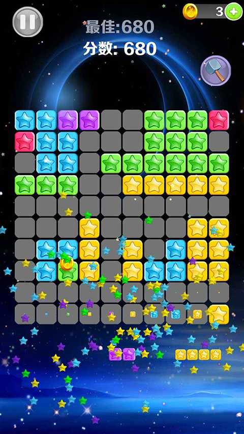 《星星消消乐》是一款以星星方块为主题的消除游戏,其独到的玩法让你不用再局限于三个同色消除,在这里,两个也能消,当然,消除的越多得分自然就越高哦。每一关都有目标得分,关卡越往后要求得分是越高