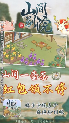 山间别院是一款非常不错的模拟经营类的手游,玩家们在游戏中能够感受到田园风格,而且众多经营乐趣带给玩家们,并且玩家们还能在游戏中领取超值的现金红包奖励呢,喜欢的朋友们快来山间别院进行体验吧