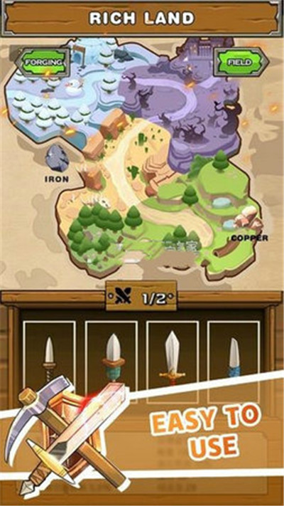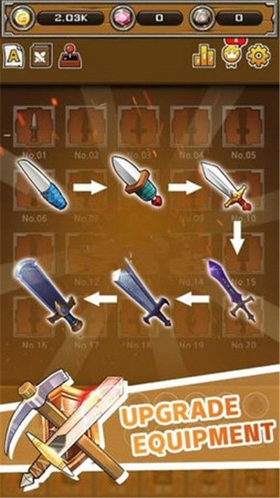 1、游戏具有很强的休闲和放置元素,你要打造出强大的武器给英雄们装备上;