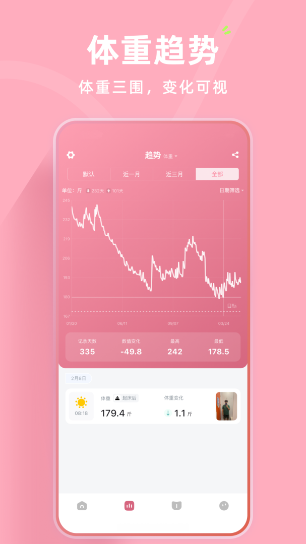 你想达到理想的体重,健康的减肥或增肌吗? 这款应用实现您的想法。 使用它设定目标体重并记录您的每日体重变化。它还会自动计算您的BMI值,并提供体重日历进行查看。此外,您还可以总结过去七天/一个月/三个月/半年的体重变化。 当然,我们还提供运动记录和体脂记录的功能。这将帮助你更好地锻炼和控制你的体重。还在等什么,快来下载吧。