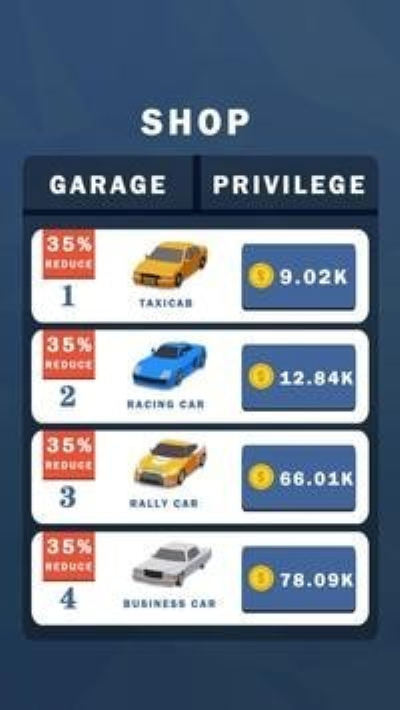 1、卡通风格的漂流赛车游戏,您可以在弯曲的赛道上自由驾驶汽车。车的水平越高,收入越高,性能越好,