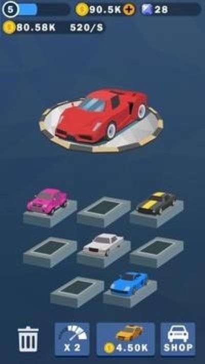 《漂移大亨(Drift Tycoon)》游戏中你将可以自由的驾驶着汽车在多个场景中进行行驶和漂移,并收集沿途的金币,还能将两种相同的汽车合成更加高级的车辆。