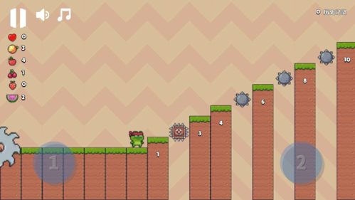 4、我们控制可爱的青蛙进行闯关,通过跳跃可以躲避各种机关和陷阱。同时也要注意把握好自己的节奏,慌乱更加容易造成失败
