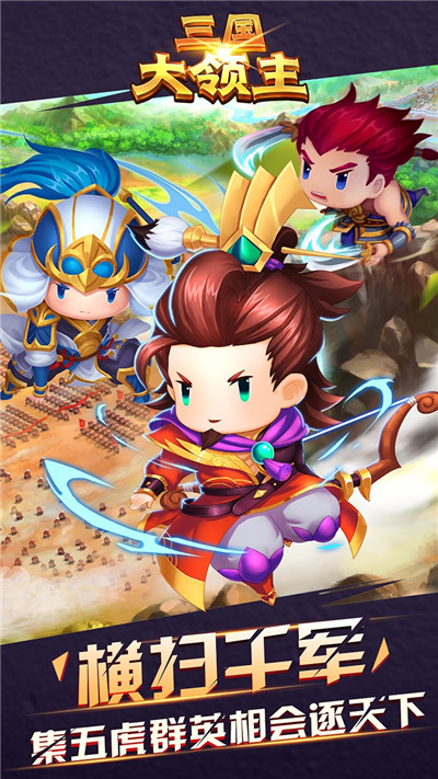 《三国大领主》是一个Q版风格建立在一个以三国世界观下的大型沙盒战争策略游戏。玩家将扮演三国时期的城主,生产战略资源、笼络名士猛将、征召百万雄兵参与到十三州的领土争夺中。这是一个以“三国”为背景的战争沙盘策略游戏,画风上承载了Q萌的武将元素,玩法上增加了独特的国战,同盟等。而它的主要特点是军团作战,强调布阵策略和临场技能释放,让你瞬间变身成为一位立马横刀的元帅的感觉,秒杀以往枯燥乏味的自动战斗模式。