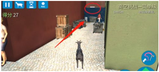 我们再去找白色能量圈。来到下图的地方,进到巷子里能看到蓝色集装箱上有一个白色的东西,就是能量圈。点山羊跳上去,舔它就自动带走。