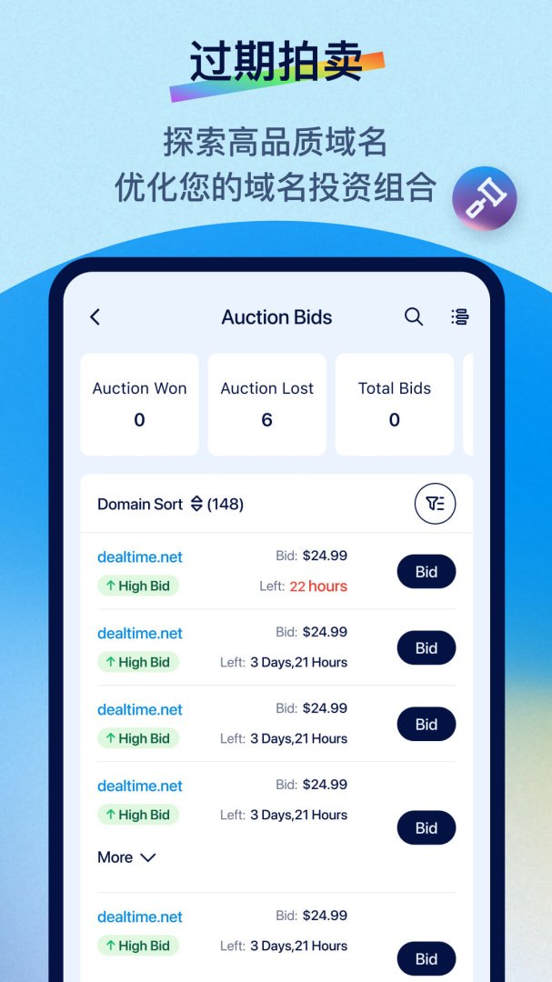 dynadot是同名域名查询与交易平台网站的移动应用,在该软件你可以完成网页端的所有行为,获取任意功能,很方便的对于起始的企业/个人网站来说,必备的实用性工具,一个好的域名便是成功的开始